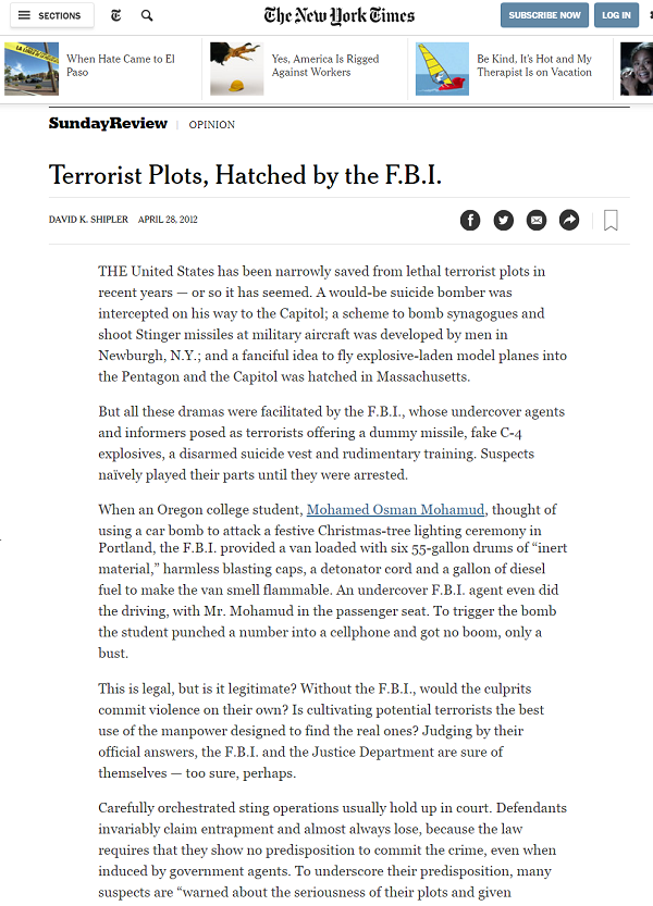 The New York Times article, Terrorist Plots, Hatched by the F.B.I.
