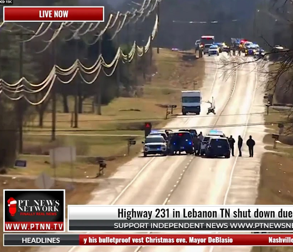 Now, a second cargo van vehicle is currently under watch in Lebanon, TN, on highway 231S, where over a dozen police vehicles have blocked off the highway to investigate. This vehicle is reportedly broadcasting the same message as the RV that exploded in Nashville, which had loudspeakers urging people to evacuate the area before the bomb went off.