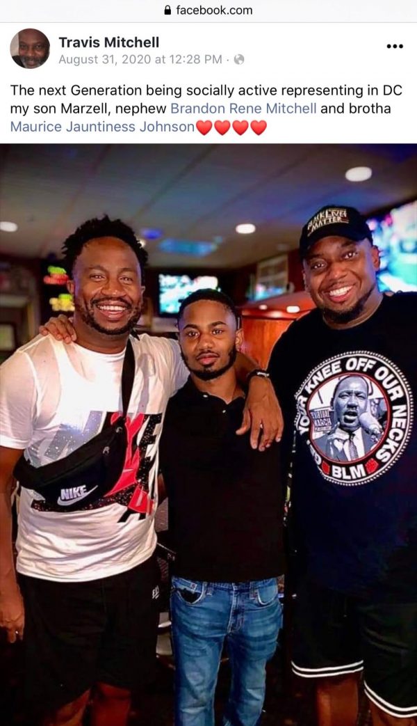 In a Facebook post dated August 31, 2020, Brandon Mitchell was pictured (seen below) wearing a shirt with the words “Get your knee off our necks” and “BLM,” which is short for Black Lives Matter. This would directly contradict his claim that he had no prior knowledge of the case