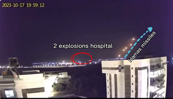 Israel’s army deliberately tried to obfuscate the path of the Jihadi rockets when they posted the following: “From the analysis of the operational systems of the [Israeli army], an enemy rocket barrage was carried out towards Israel, which passed through the vicinity of the hospital when it was hit.” This is deliberately misleading. Yes, the rockets were in the vicinity, but they were moving away from the hospital, not over it nor towards it.