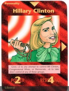 Another card shows a bomb exploding at the Pentagon. Yet another shows a blond-haired “Charismatic Leader” that’s a white man with broad shoulders leading a crowd of “fanatics.” Then of course there’s a card for the nefarious Hillary Clinton character and the insidious Saddam Hussein. The cards even delve into social phenomenon we’re all experiencing now, with the politically-motivated use of “Insensitive Pronouns.” Really?
