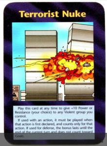 Check out the “Terrorist Nuke” card that shows one of the Twin Towers exploding nearly exactly where the (drone) commercial jet crashed into the massive building on September 11th, 2001. How could this predictive card be so accurate and 9/11 not be some kind of “inside job?”